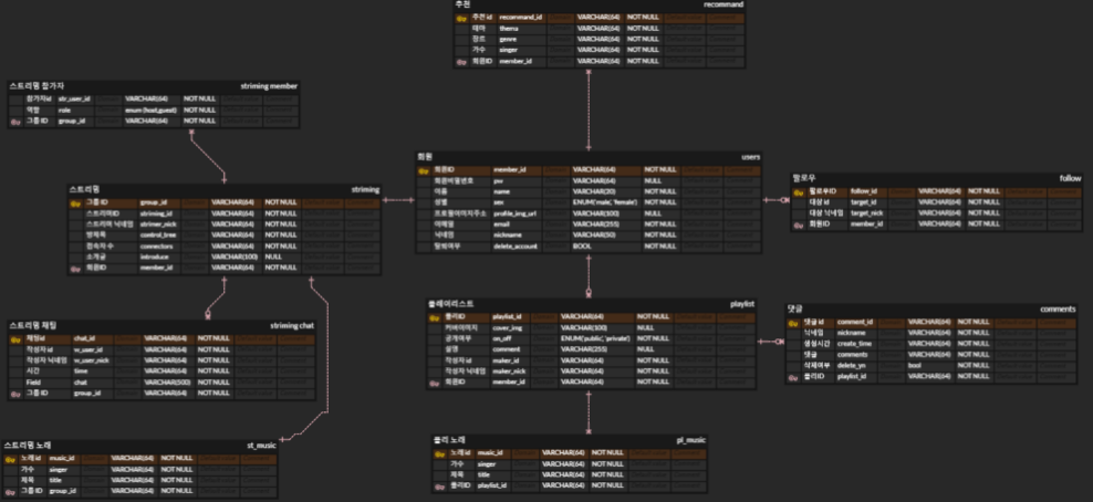 처음 db를 정할 때 redis라는 nosql db를 사용하려고 했었다. 하지만 실시간 채팅, 음악 추천 기능을 spring을 이용해 만드는 과정이 너무 어렵고 오래 걸릴것 같아서 사용해본 mysql을 사용하기로 했다.