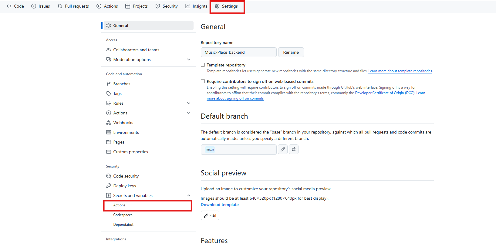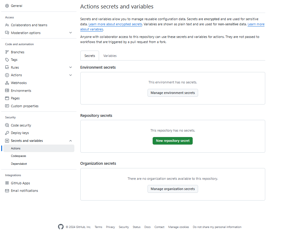 git-secret를 등록할 레포지토리에서 Settings -> Secrets and variables -> Actions로 이동한다