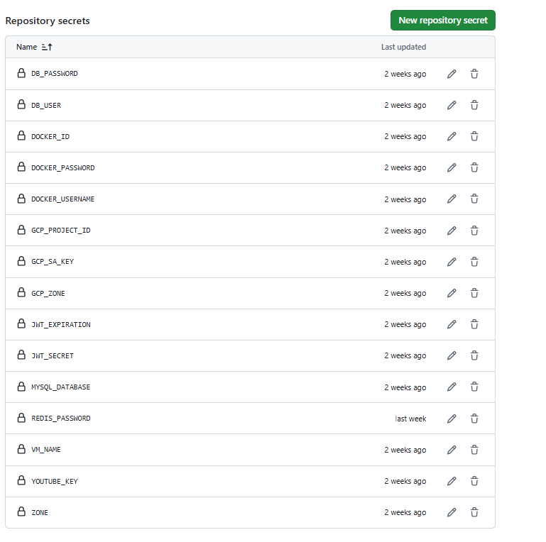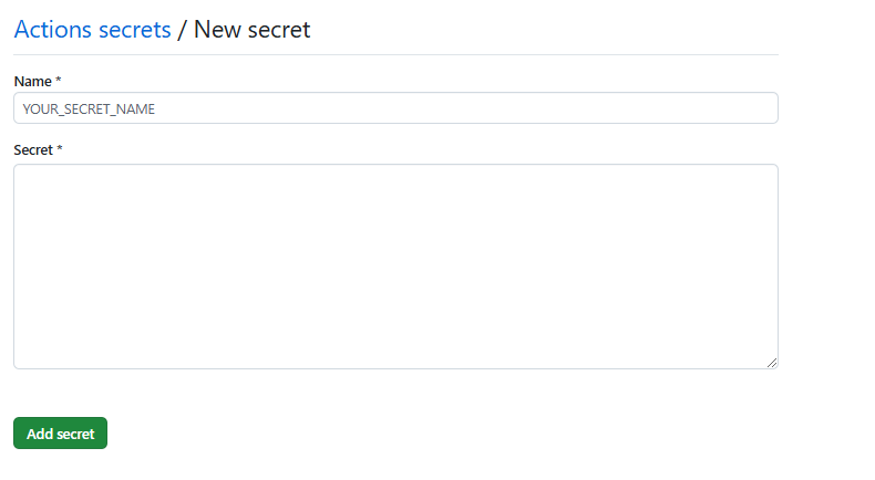 Repository secrets -> New repository secret(초록버튼)을 클릭하여 new secret 화면으로 이동한다.