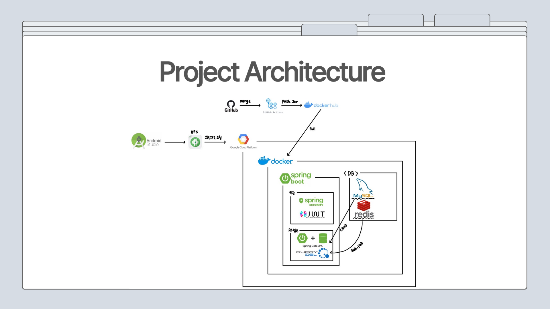 프로젝트 아키텍처에서 보는 것과 같이 백엔드는 spring 프로젝트를 jar 파일로 만들어서 mysql과 redis를 함께 도커 컨테이너로 gcp에 배포하였다. 프런트엔드는 apk 파일로 만들어서 다운로드하여 사용할 수 있도록 만들었다.