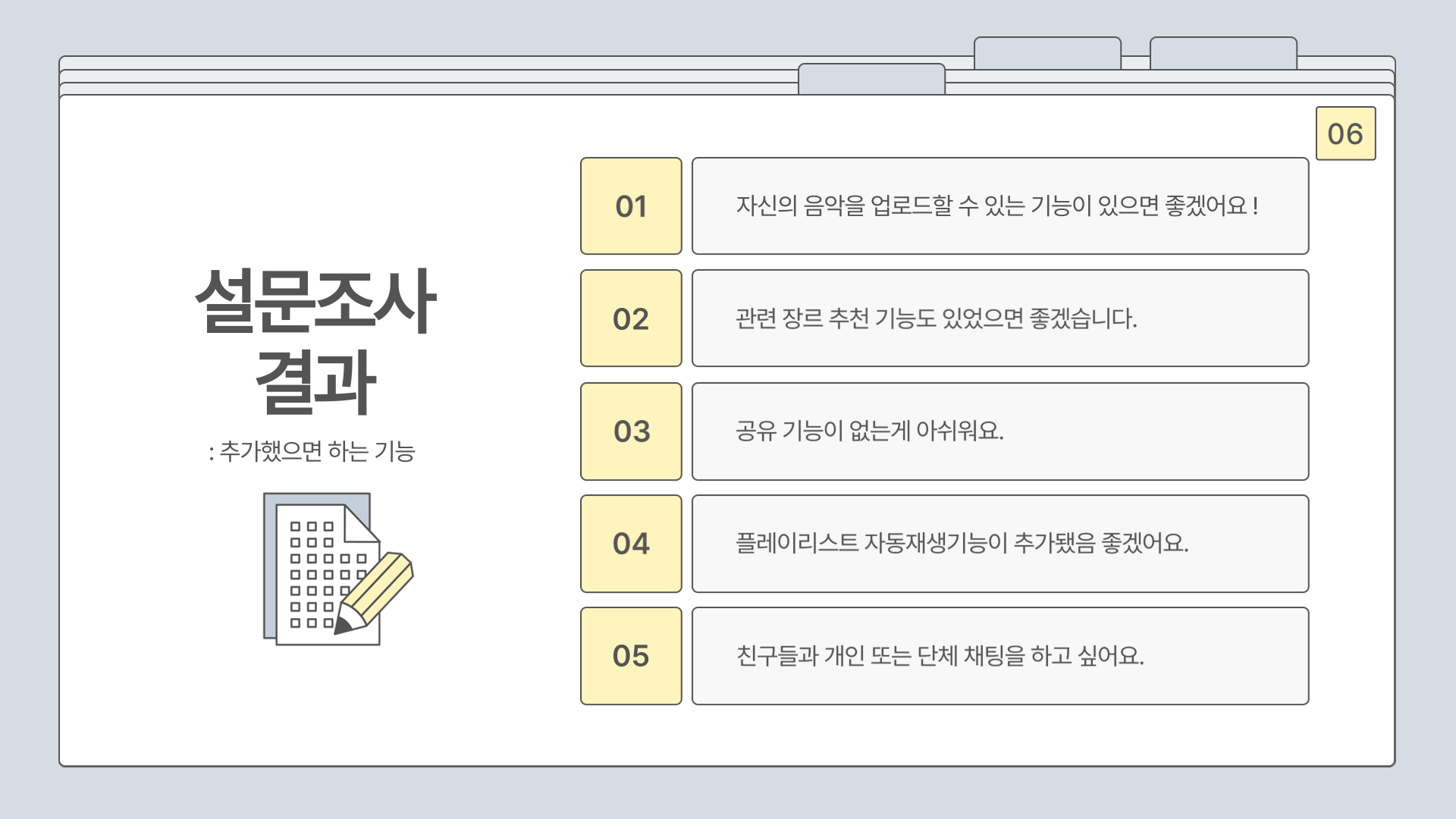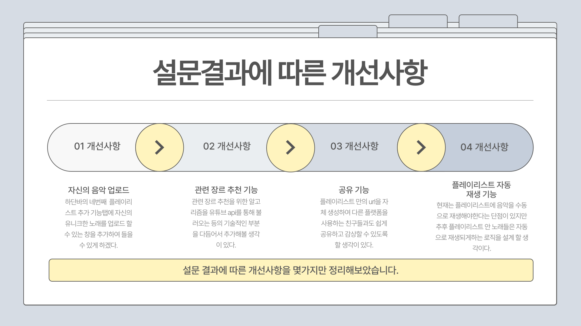 베타테스터들의 의견을 반영하여, 향후 알고리즘 기반 음악 추천, 플레이리스트 자동 재생, 프라이빗 개인 및 단체 채팅 등 다양한 기능을 추가할 계획이다.