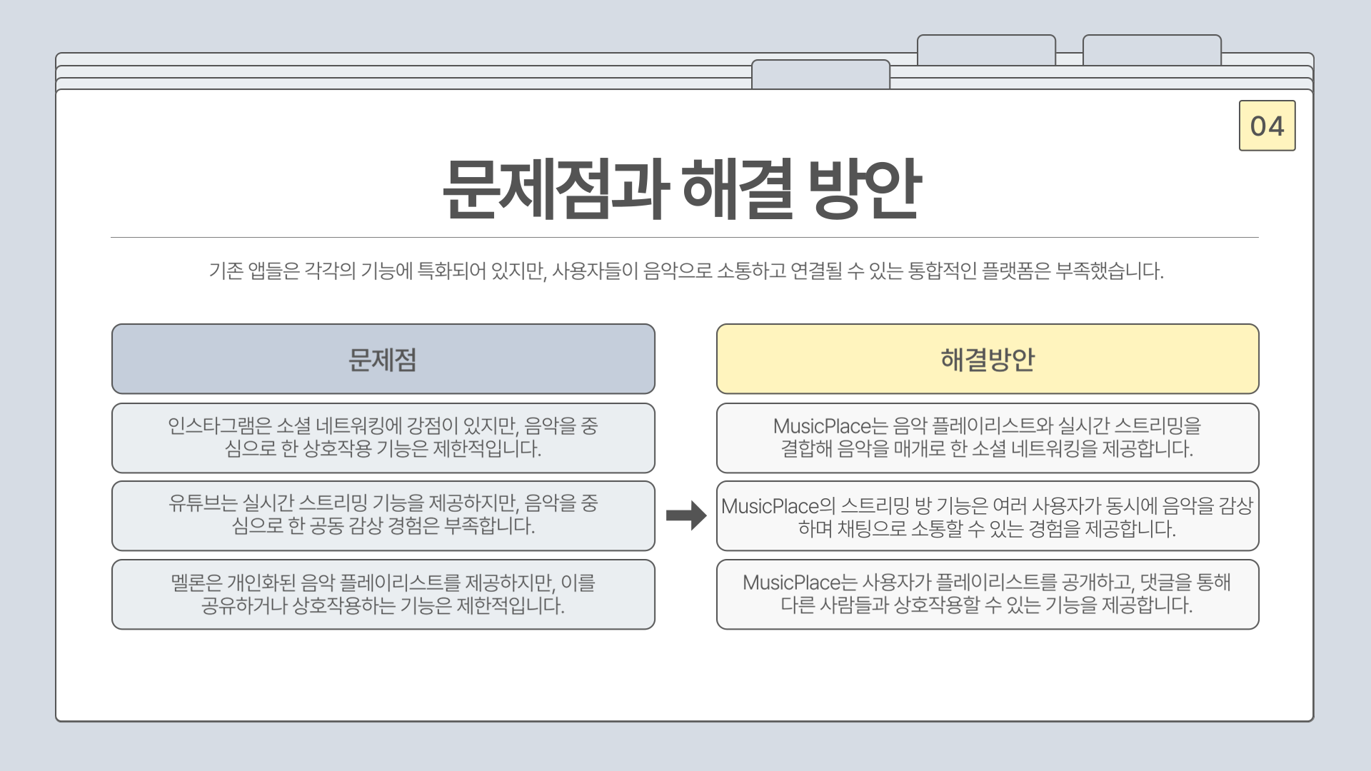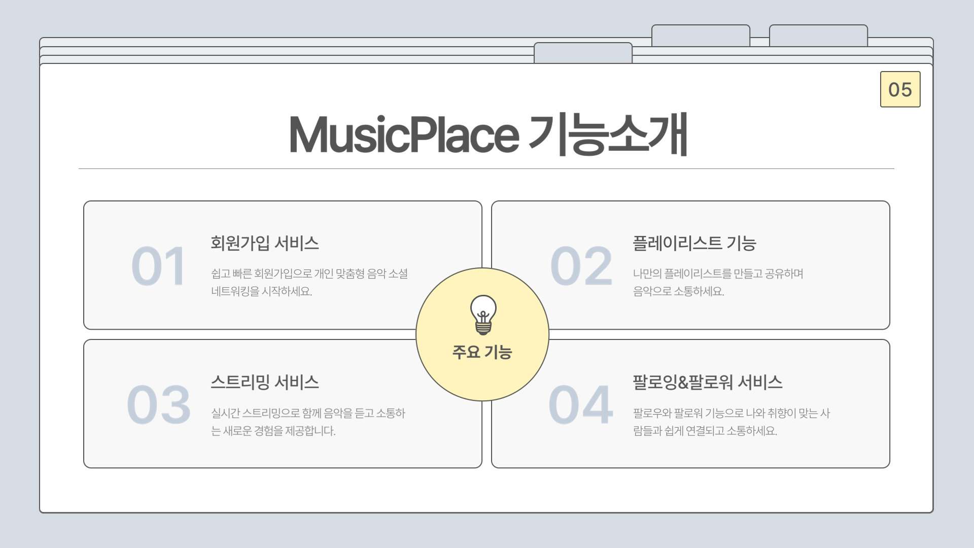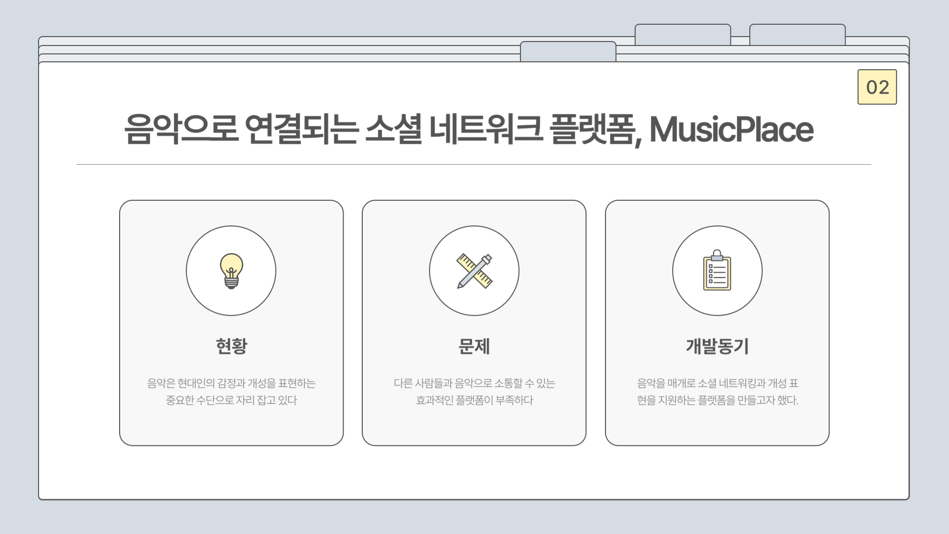 music place 프로젝트의 주제는 자신의 취향을 반영한 음악 플레이 리스트를 다른 사람과 공유하고 함께하고 싶다는 생각에서 출발하게 되었다.