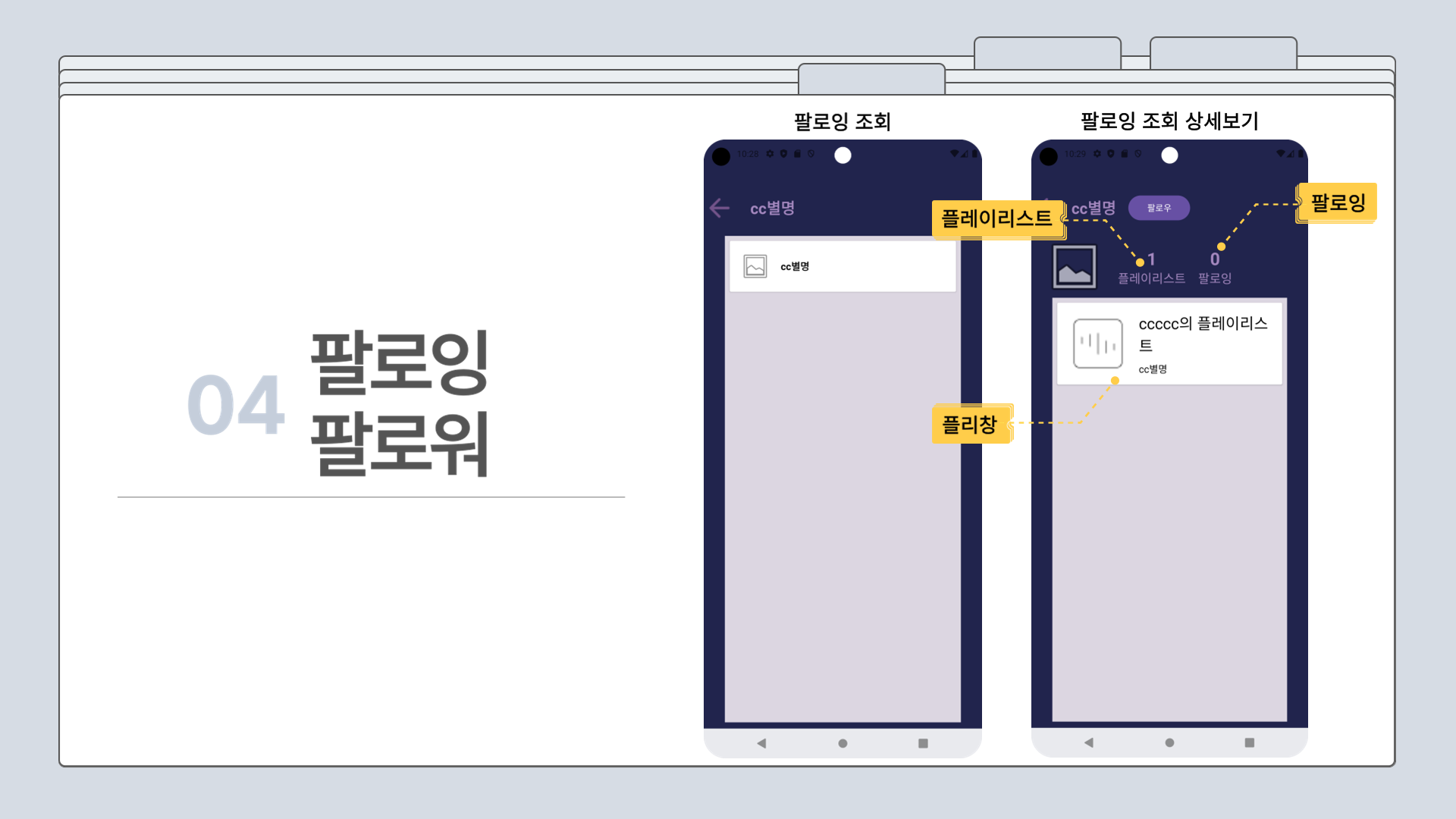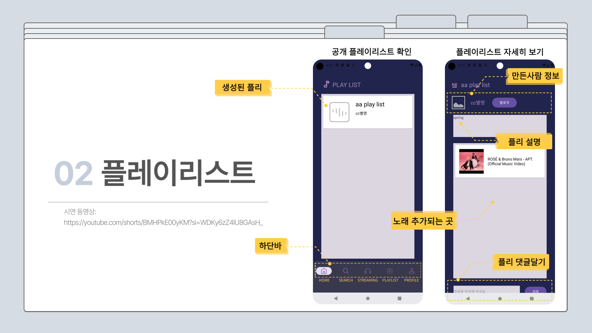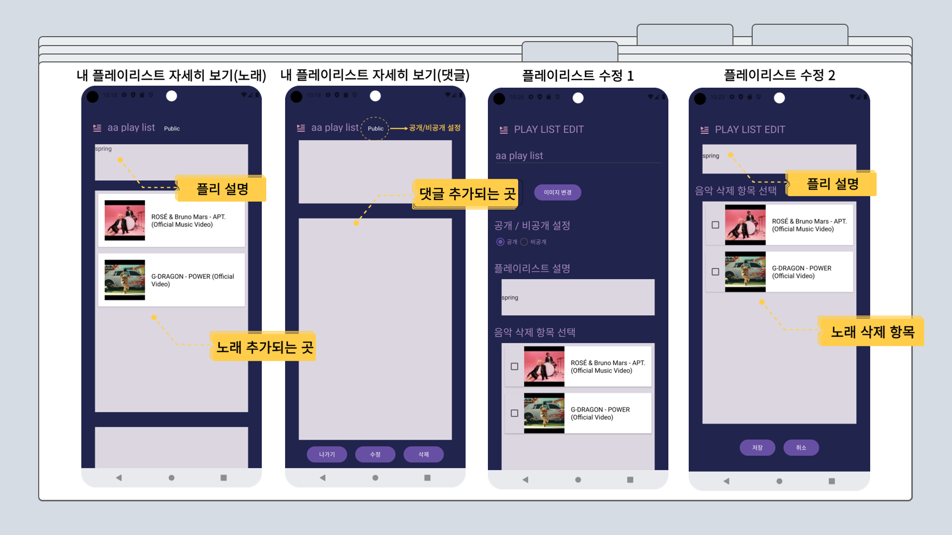 로그인 이후 가장 처음 나오는 화면은 공개 플레이리스트 목록이다. 이 화면에서는 다른 사용자들이 공개로 설정한 플레이리스트를 보고, 댓글 쓰기, 팔로우 등록을 할 수 있다. 이 화면에서 작성된 정보는 MySQL에 저장된다.