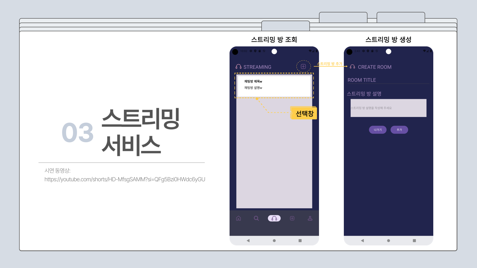 MusicPlace 프로젝트에서 저는 안드로이드 스튜디오를 이용한 애플리케이션 개발, MySQL을 활용한 데이터베이스 설계, Spring Security와 JWT를 기반으로 한 보안 구현, 그리고 WebSocket과 Redis를 활용한 스트리밍 서비스의 영상 공유 기능을 담당했다.