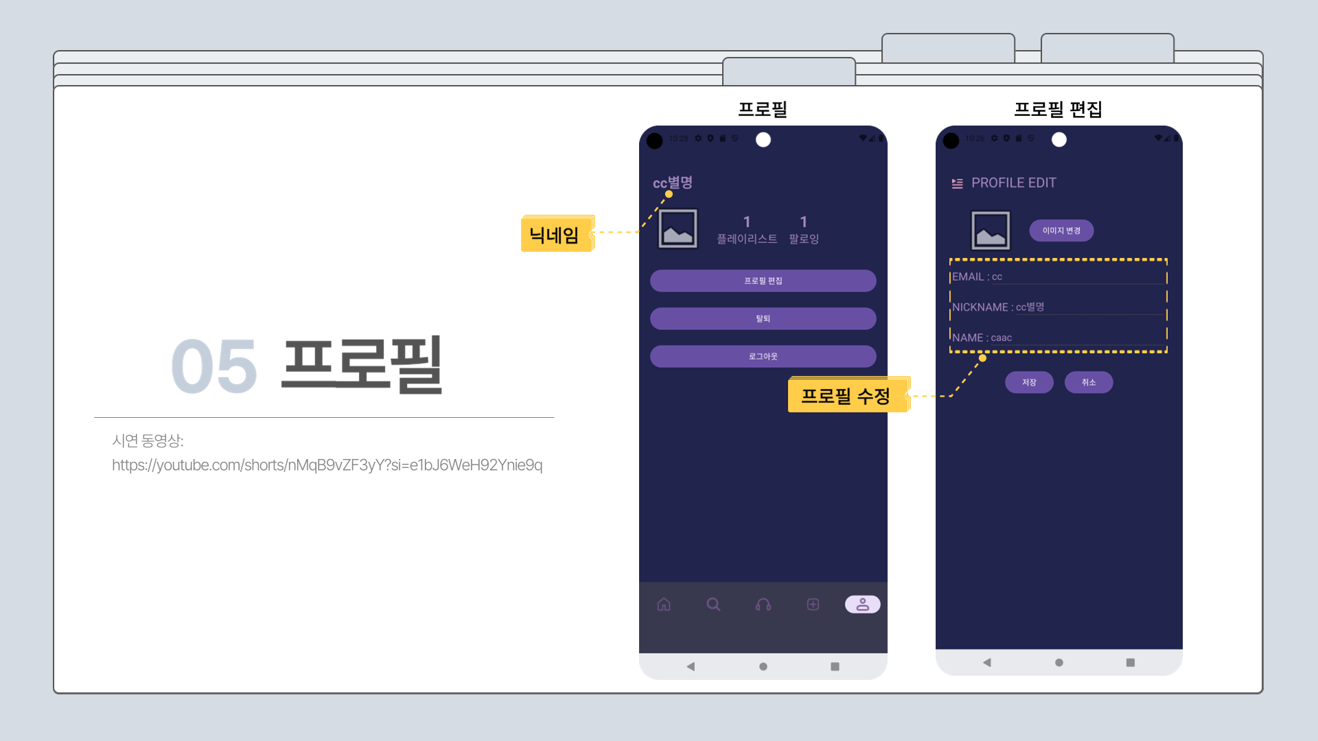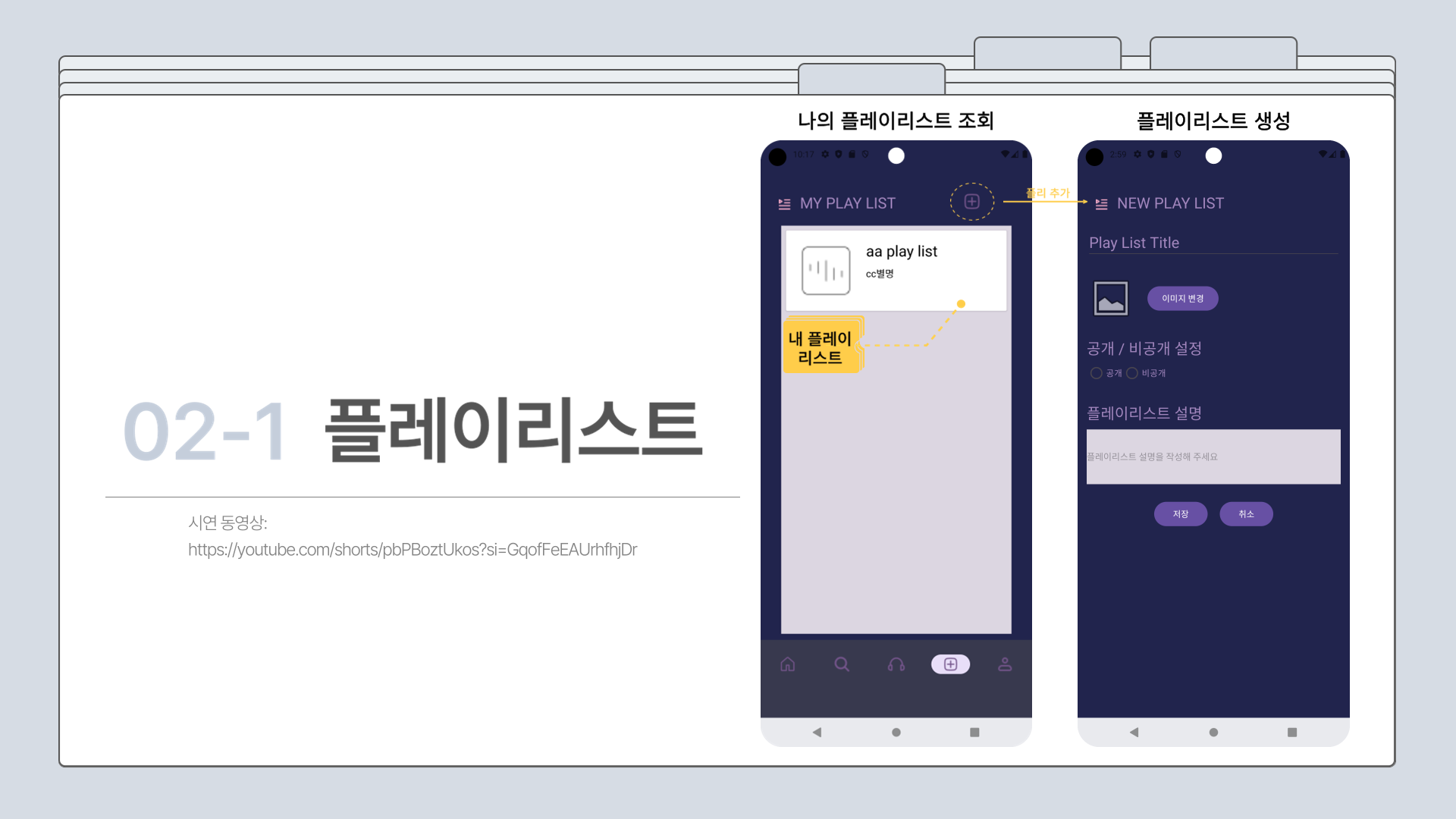 사용자가 음악을 저장할 수 있는 플레이리스트를 만들 수 있다. 플레이리스트를 생성할 때 제목, 커버 이미지, 설명, 공개 여부를 설정할 수 있다. 또한 이미 만들어진 플레이리스트의 수정 버튼을 클릭하면 공개 여부, 설명, 커버 이미지, 음악 삭제 등의 수정을 할 수 있다. 이 화면에서 생성, 수정, 삭제되는 데이터는 MySQL에 저장된다.