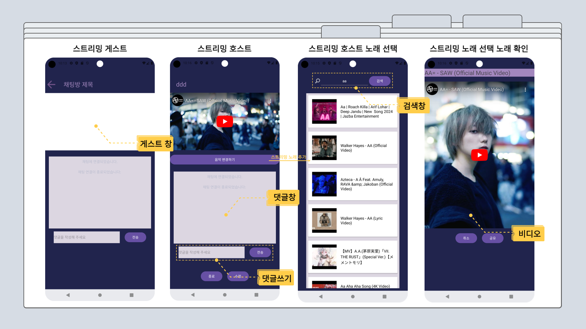 스트리밍 방 목록에서 마음에 드는 방을 클릭하고 들어오면 채팅과 호스트가 공유하는 유튜브 영상을 볼 수 있다.
