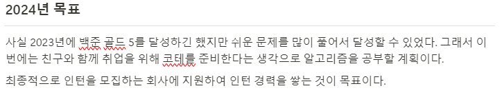 2023년도에 계획했던 목표와 달리 2024년에 코딩 테스트 공부를 전혀 하지 않았다. 또한 학교에서 인턴 공고를 보고 지원하려고 했지만 결국 지원을 포기했다.