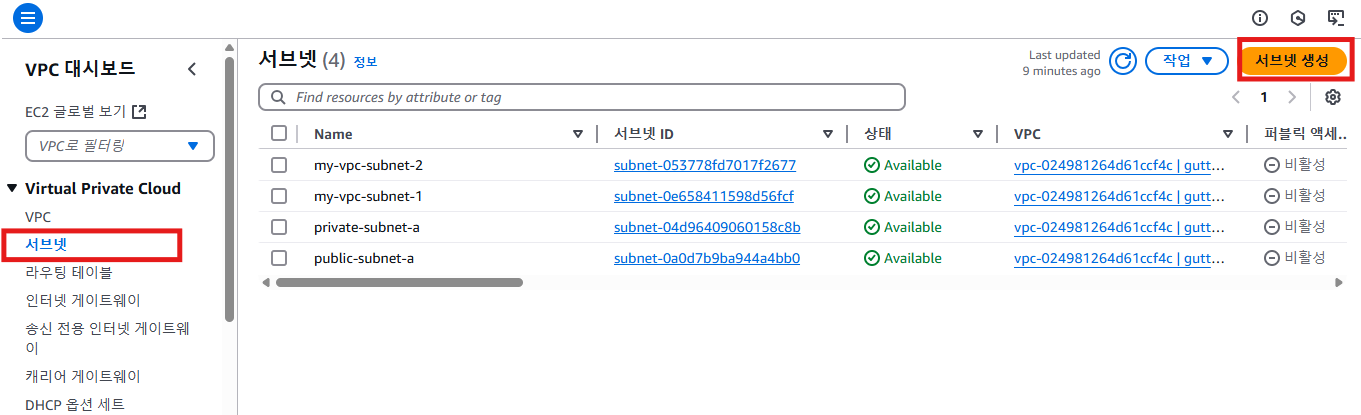 이후 하단의 주황색 서브넷 생성을 클릭하면 서브넷이 생성된것을 확인할 수 있다