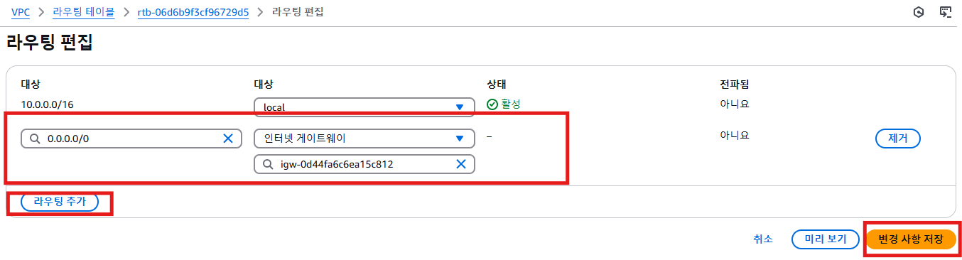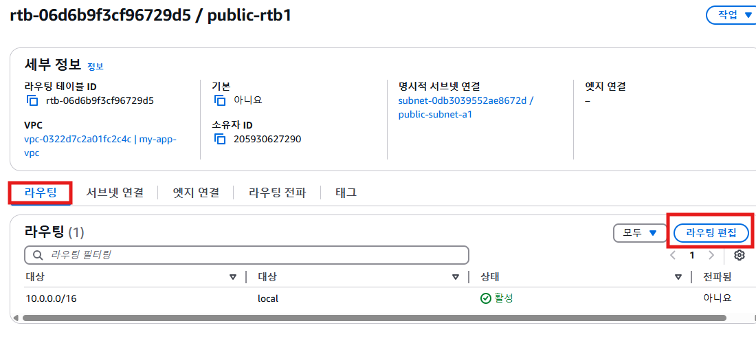 public-rtb1은 아까 만들었던 인터넷 게이트웨이를 라우팅 추가 해준다(private-subnet-a1은 내부에서 사용해서 필요 없음)