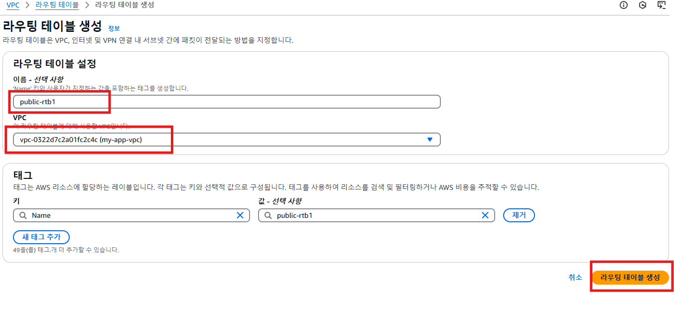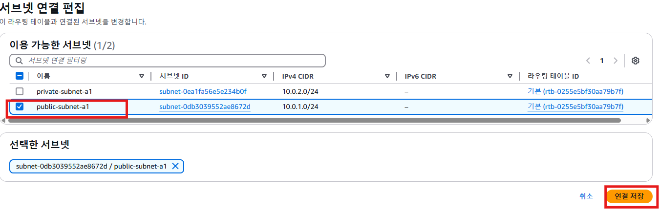 public-subnet-a1(퍼블릭 서브넷)과 연결하는 public-rtb1