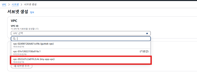 vpc 선택에서 아까 생성한 vpc를 선택한다