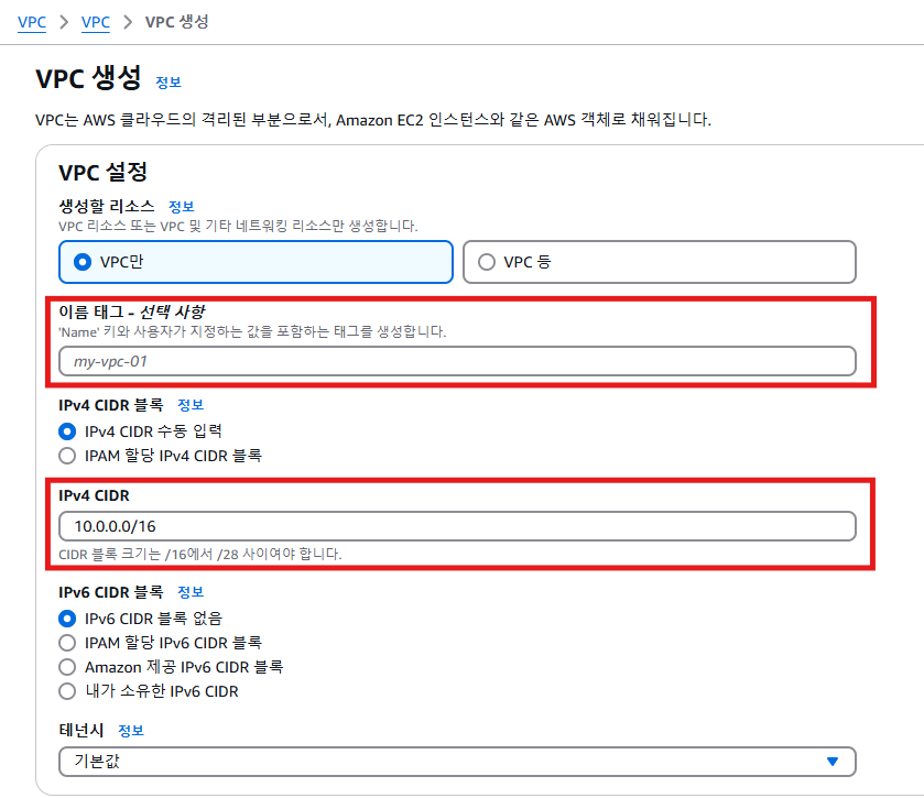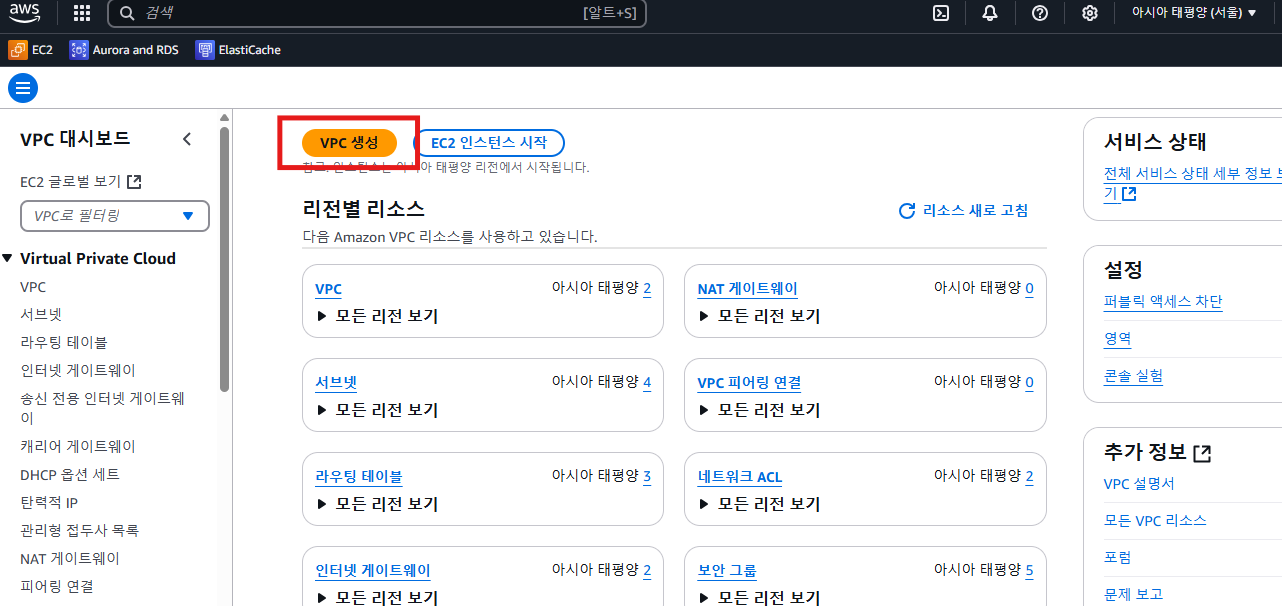 vpc 대시보드에서 vpc 생성 클릭