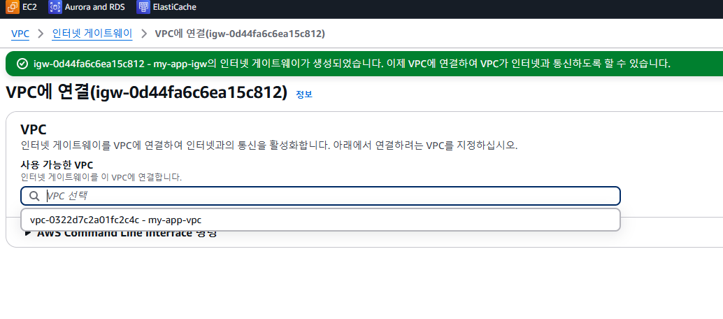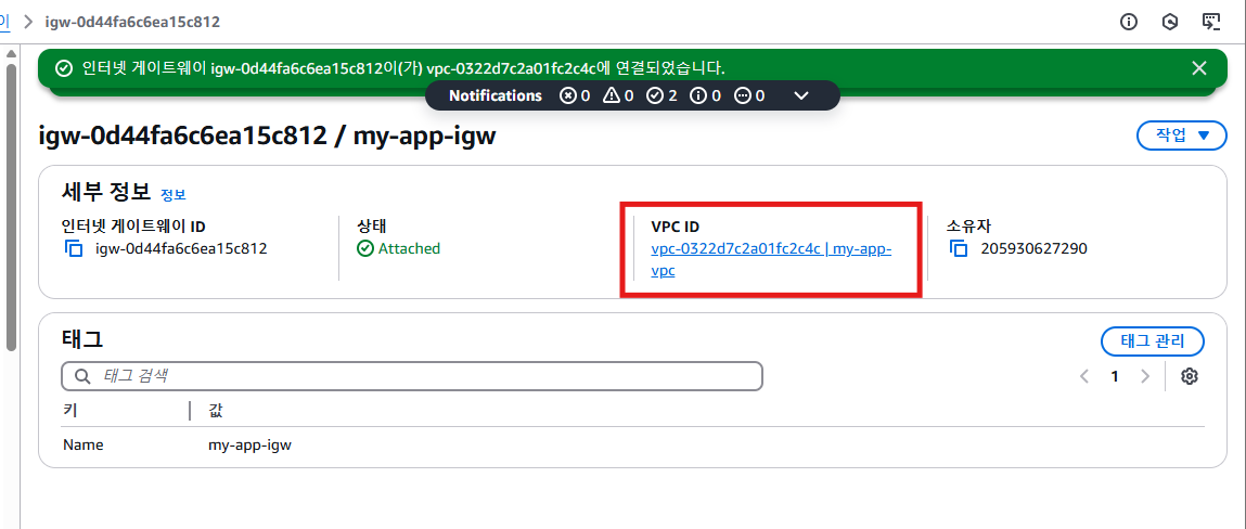 생성된 인터넷 게이트웨이를 확인하고 vpc와 연결해 준다.