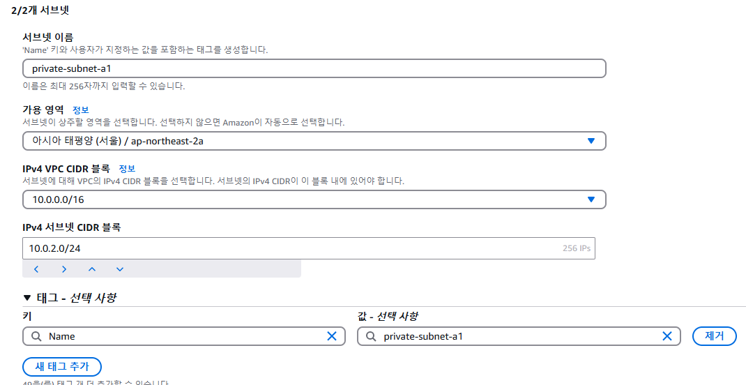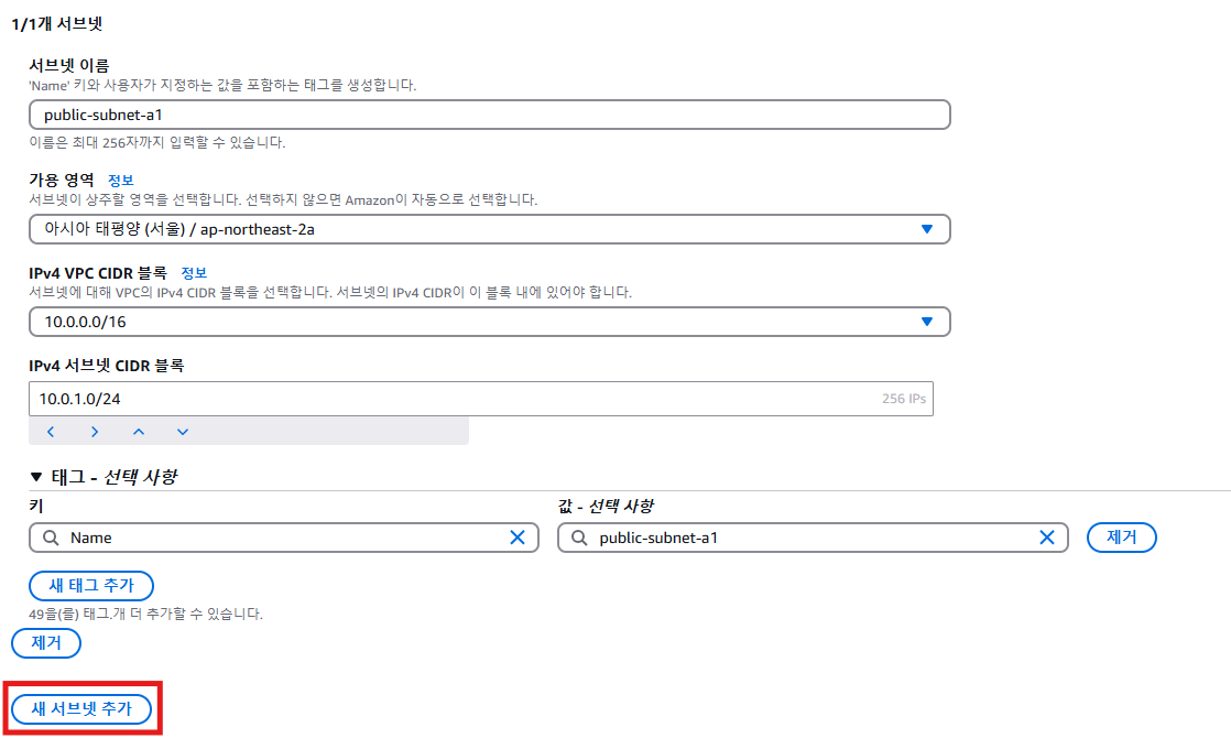 퍼블릭 서브넷을 추가한 뒤 하단의 새 서브넷 추가를 클릭해서 프라이빗 서브넷도 생성할 수 있도록 한다