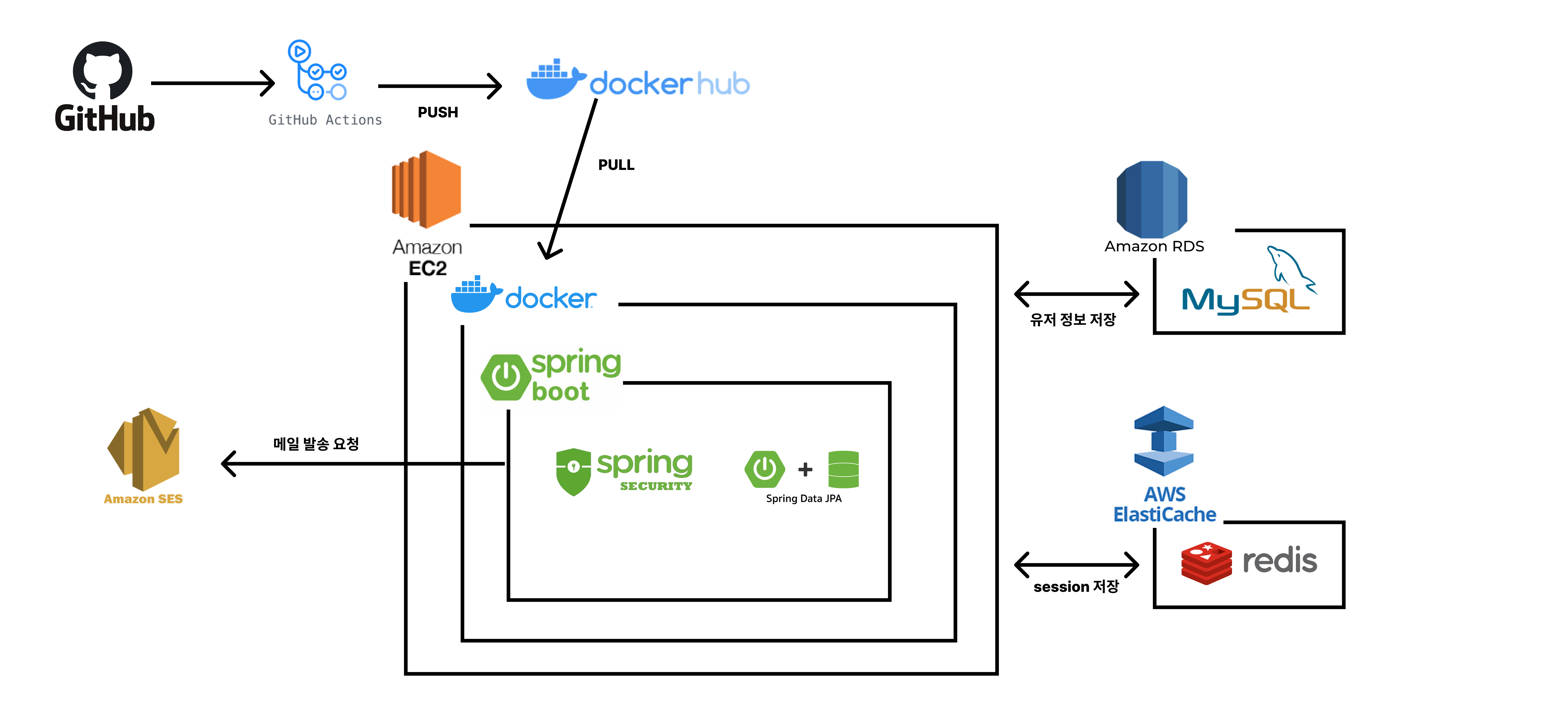 이런식으로 aws ec2에 프로젝트 도커 이미지를 저장하고, rds와 elasticache를 사용하려고 한다.