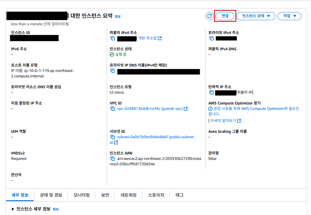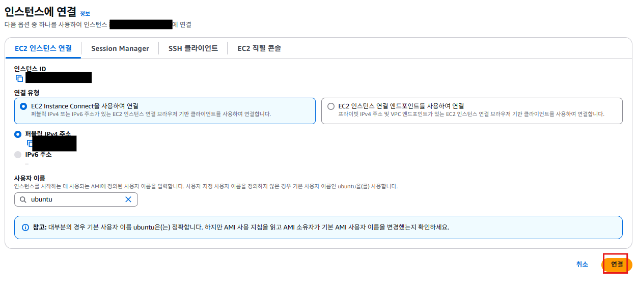 ec2 데시보드에서 인스턴스를 선택한 뒤 연결을 클릭한다